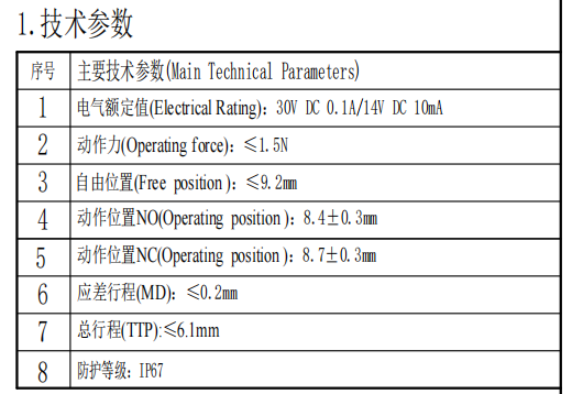 | 1 | Електрични рејтинг | 10МА 14В ДЦ / 0.1А 30ВДЦ | |